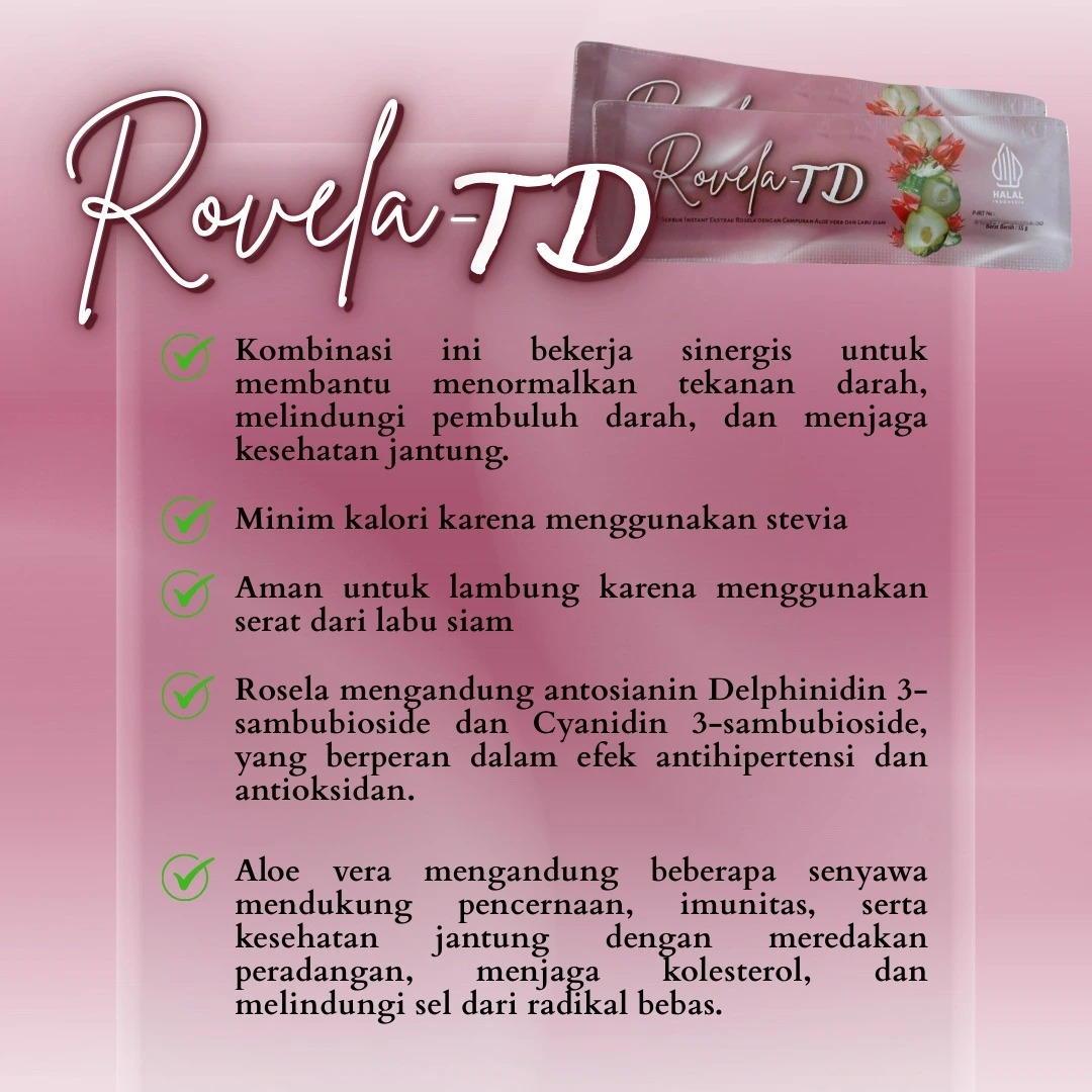Percayakan kesehatan anda pada Rovela-TD. Minuman serbuk ini membantu menormalkan hipertensi, aman bagi lambung, dan rendah kalori. Tunggu apa lagi? Pesan sekarang dan rasakan sendiri manfaatnya!